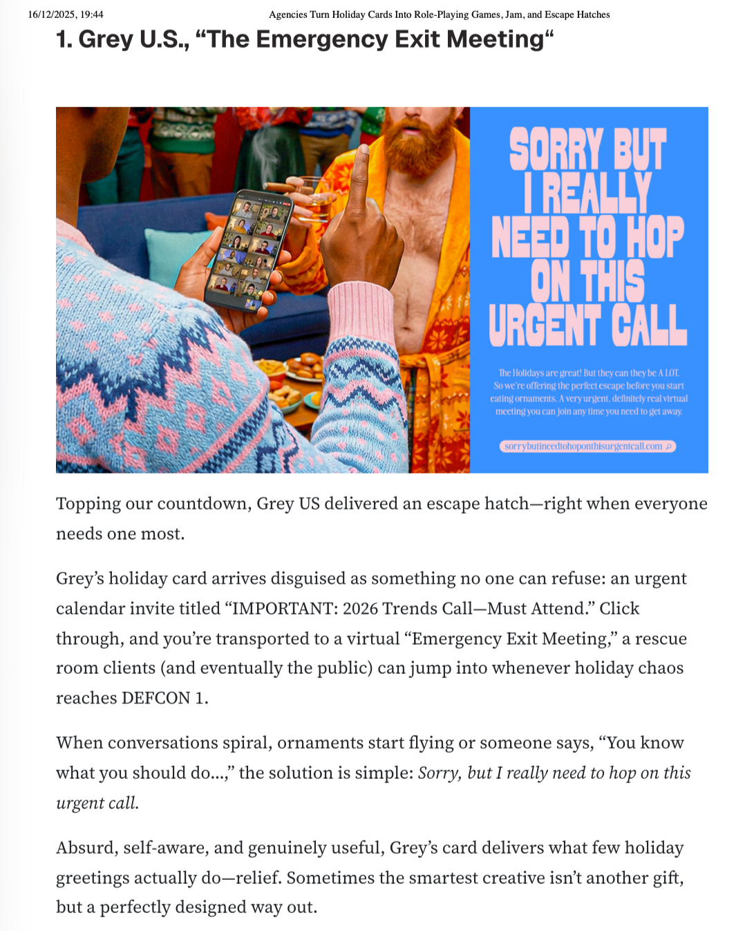 Holiday gatherings can be more exhausting than any workday. And in those moments, nothing works faster than, “Sorry, I really need to hop on this very urgent meeting.” So as a gift to our clients, we sent SorryIReallyNeedToHopOnThisUrgentCall.com—along with a calendar block during Christmas week. At any time, they could jump into a Teams meeting running on a continuous loop all holiday season. Whenever things got awkward, they could pull it up, say they had to join a definitely real meeting, and make their escape.