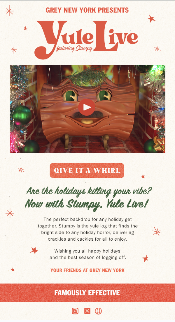 Hours long yule logs are on everyone's tv’s during parties over the holidays. So instead of a traditional gift for Grey’s clients we gave them a linik to Stumpy. The Yulle log that reminds your that Yulle live through this holiday season. Its a 4 hour video that plays a gentle fire, holiday music and every so often gives you comedic relief. Everyone could use a friend, especially during the holidays.